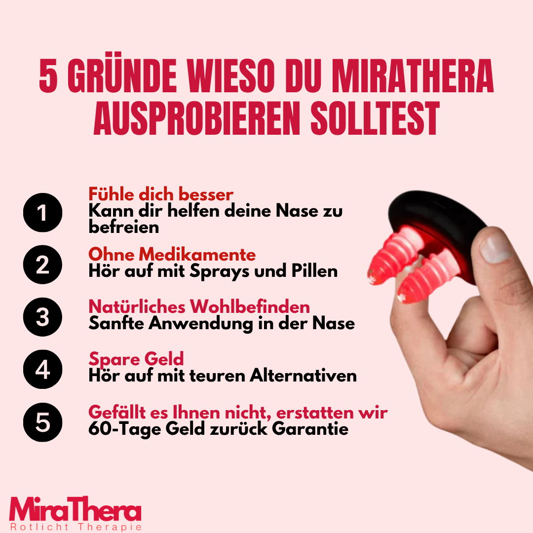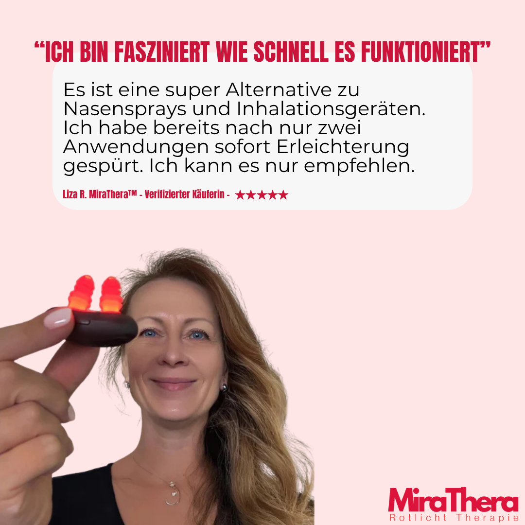 Schluss mit teuren Nasensprays und ständigen Tabletten. MiraThera bietet eine einfache Möglichkeit, deine Nase auf natürliche Weise zu pflegen und dich im Alltag wohler zu fühlen.